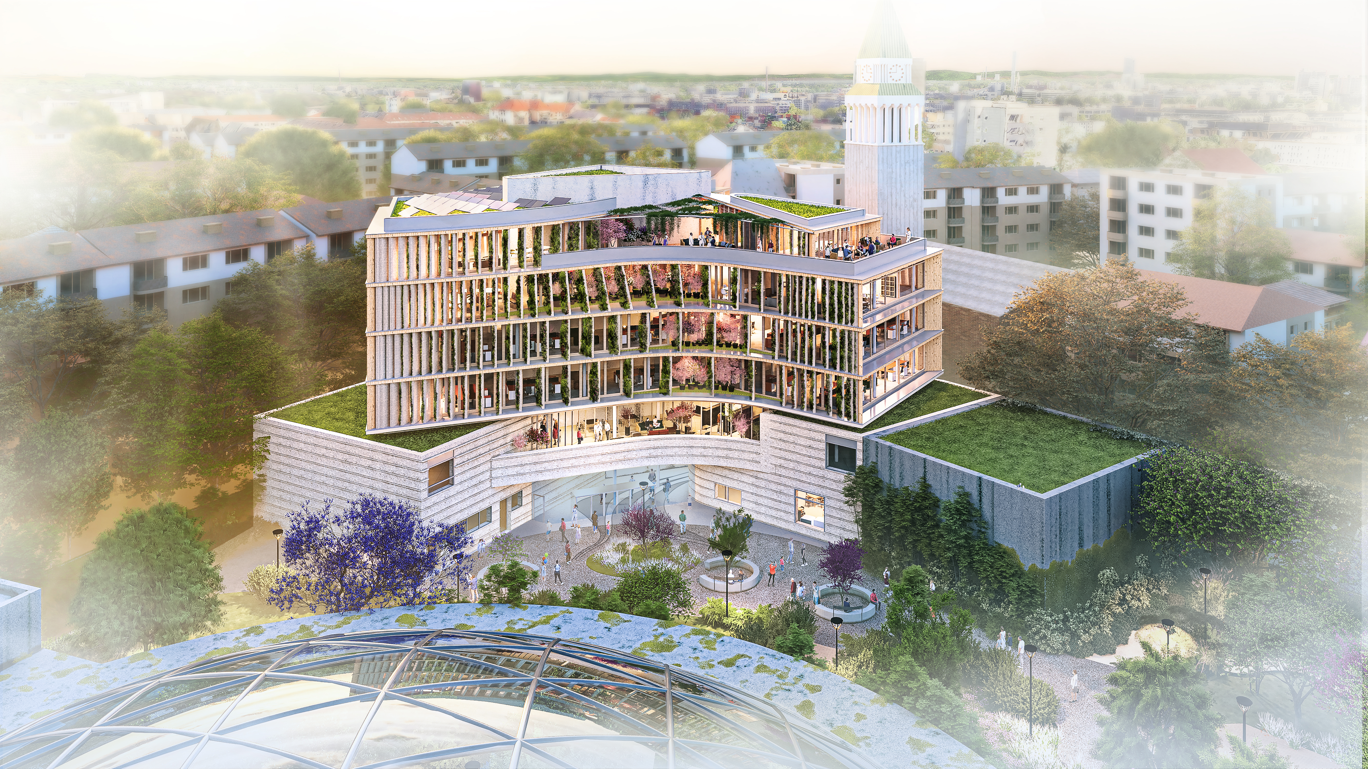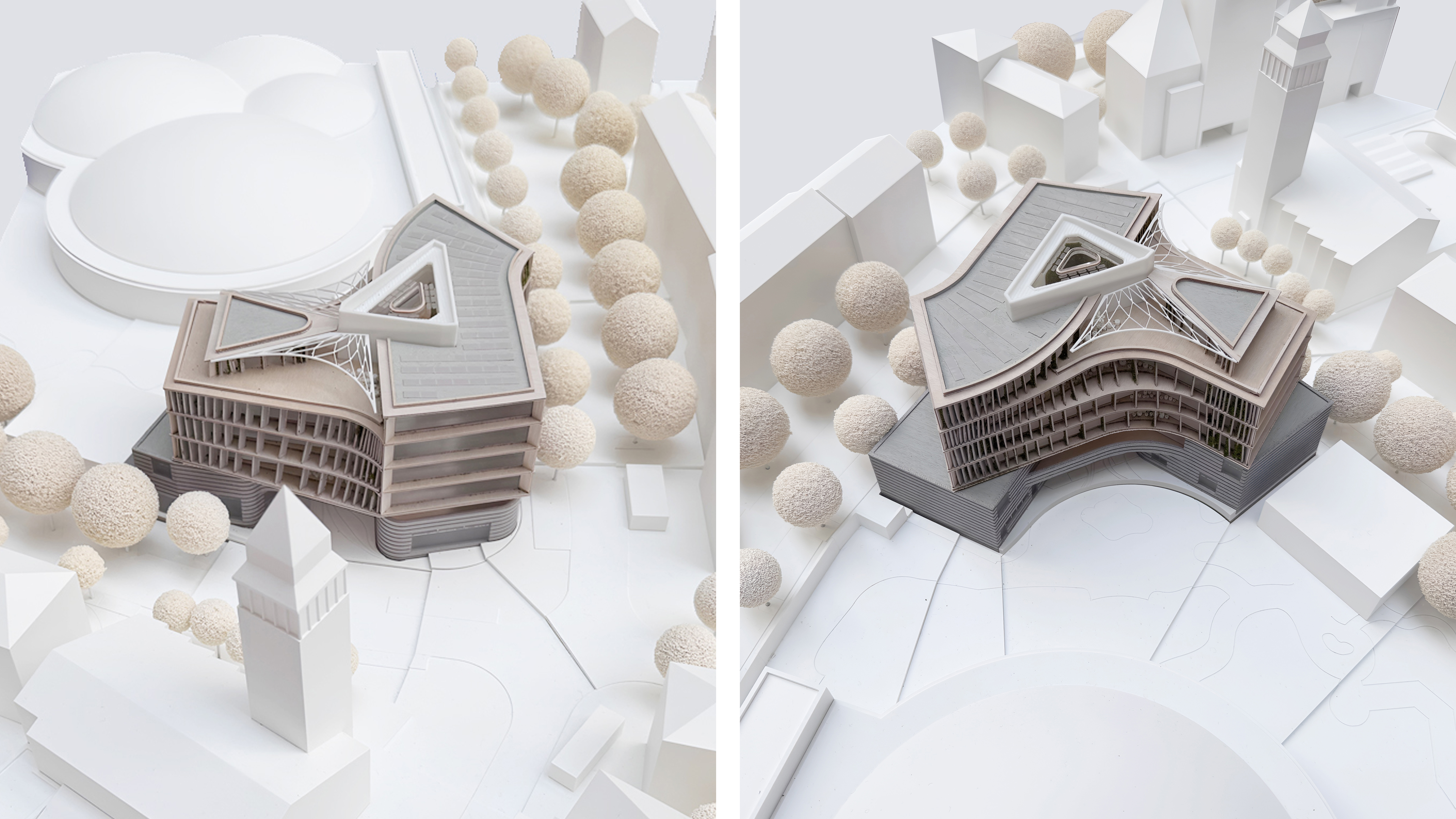 Die Fassadengestaltung folgt konsequent dem konzeptionellen Ansatz. Der in Lehm ausgeführte massive Sockel verleiht dem Gebäude Erdung und Präsenz und unterstützt durch die fließende Bewegung seiner Umfassungswände die dynamische Gesamtwirkung. Die in den Obergeschossen vorgesehenen begrünten PV-Lamellen unterstreichen die angestrebte Leichtigkeit und verweisen zugleich auf den nachhaltigen Anspruch des Entwurfs.