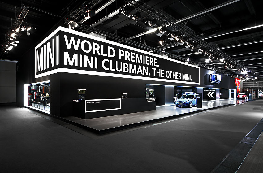 Der Messeauftritt fokussiert die Weltpremiere des MINI Clubman. Es wird eine stilbildende sich an Kunst, Mode, Clubbing orientierende Markeninszenierung realisiert. Der Gebäudekubus greift die Länge des Premierenfahrzeugs auf und kommuniziert durch seine textile Materialität im Innen und Außen, eine Referenz an Mode. Im Innenbereich entsteht ein perspektivisch überhöhter Inszenierungsraum, mit dem "MINI Clubman Catwalk" als Zitat aus der Modewelt, als zentralem Element.