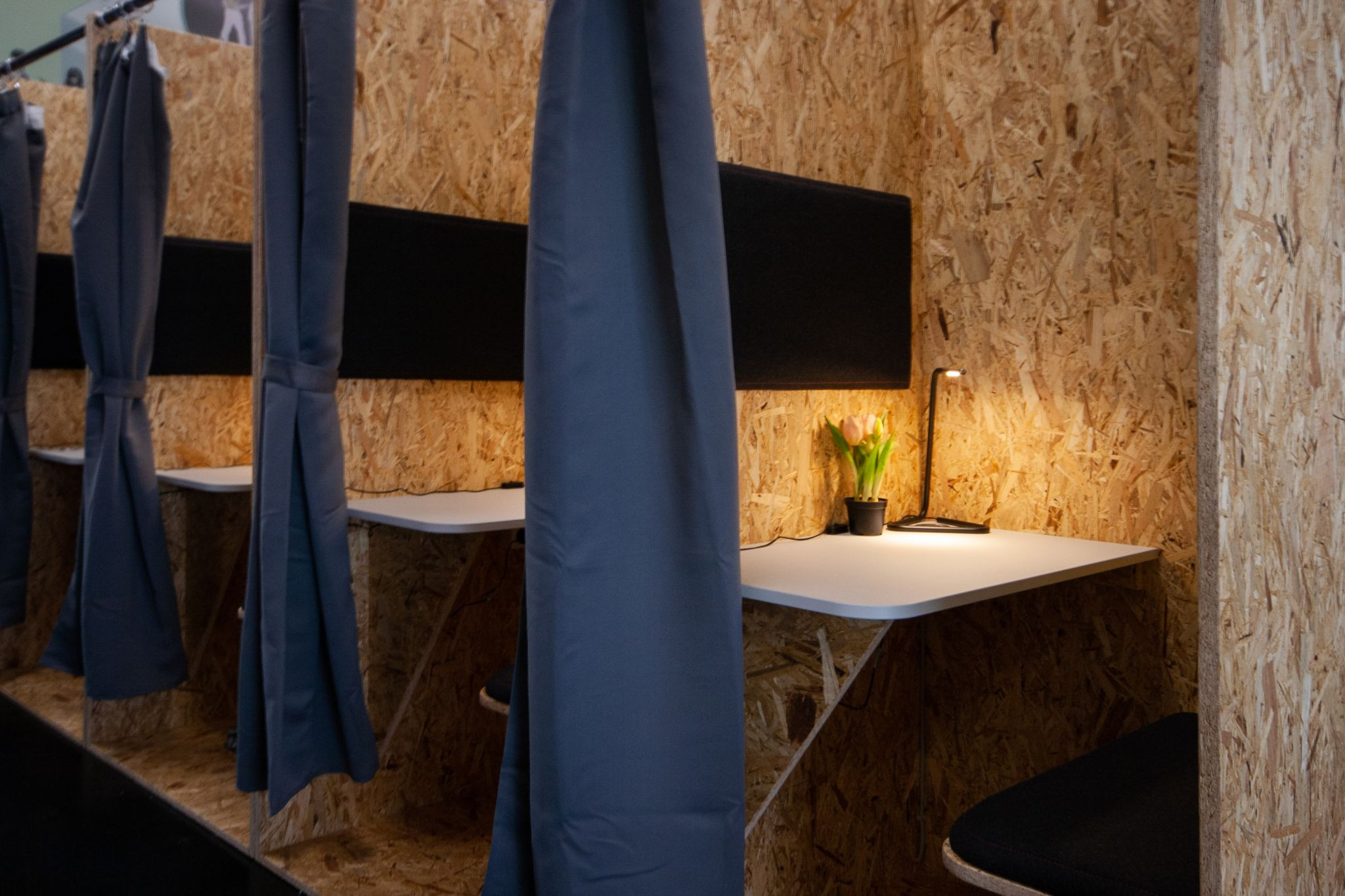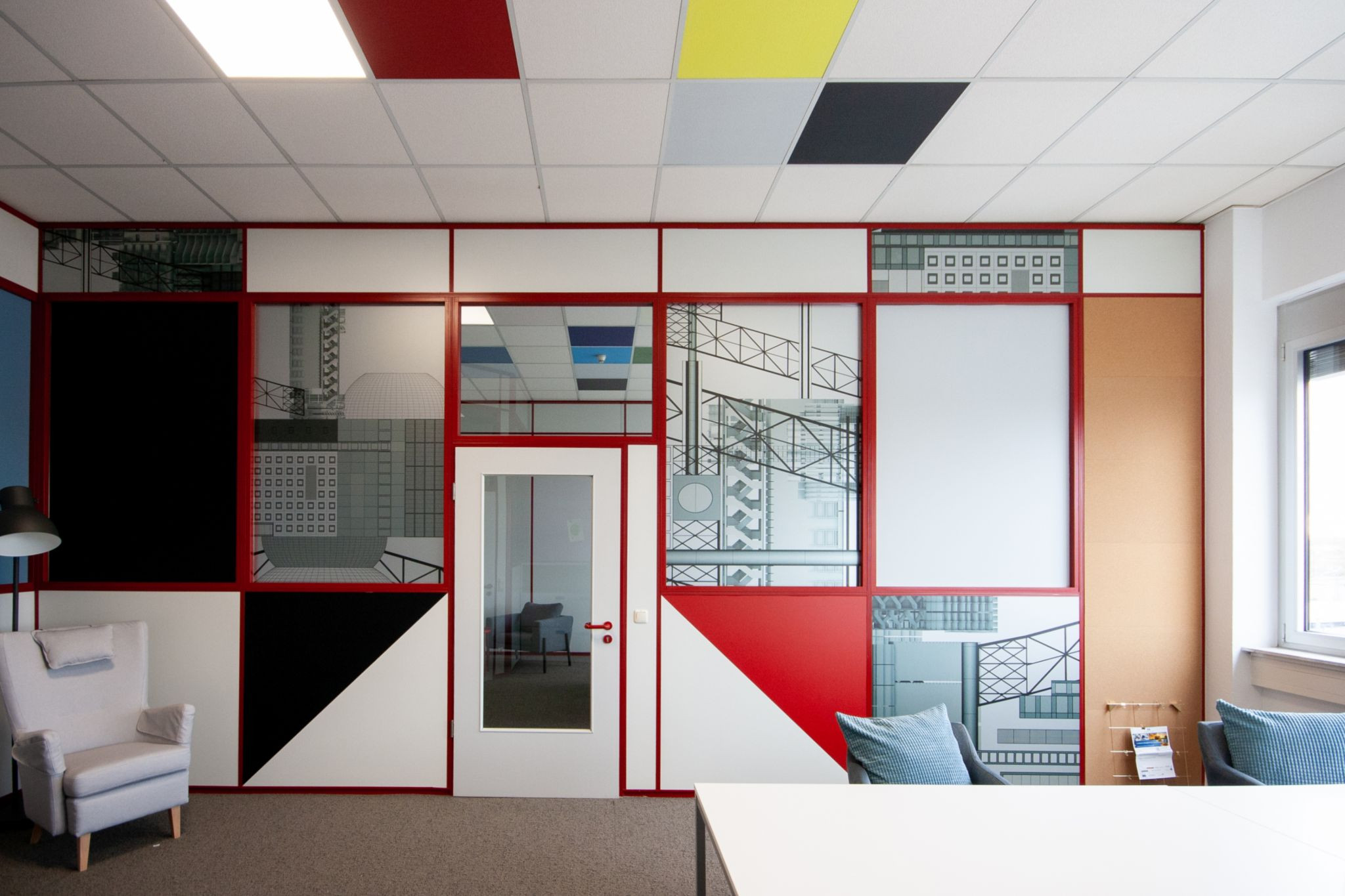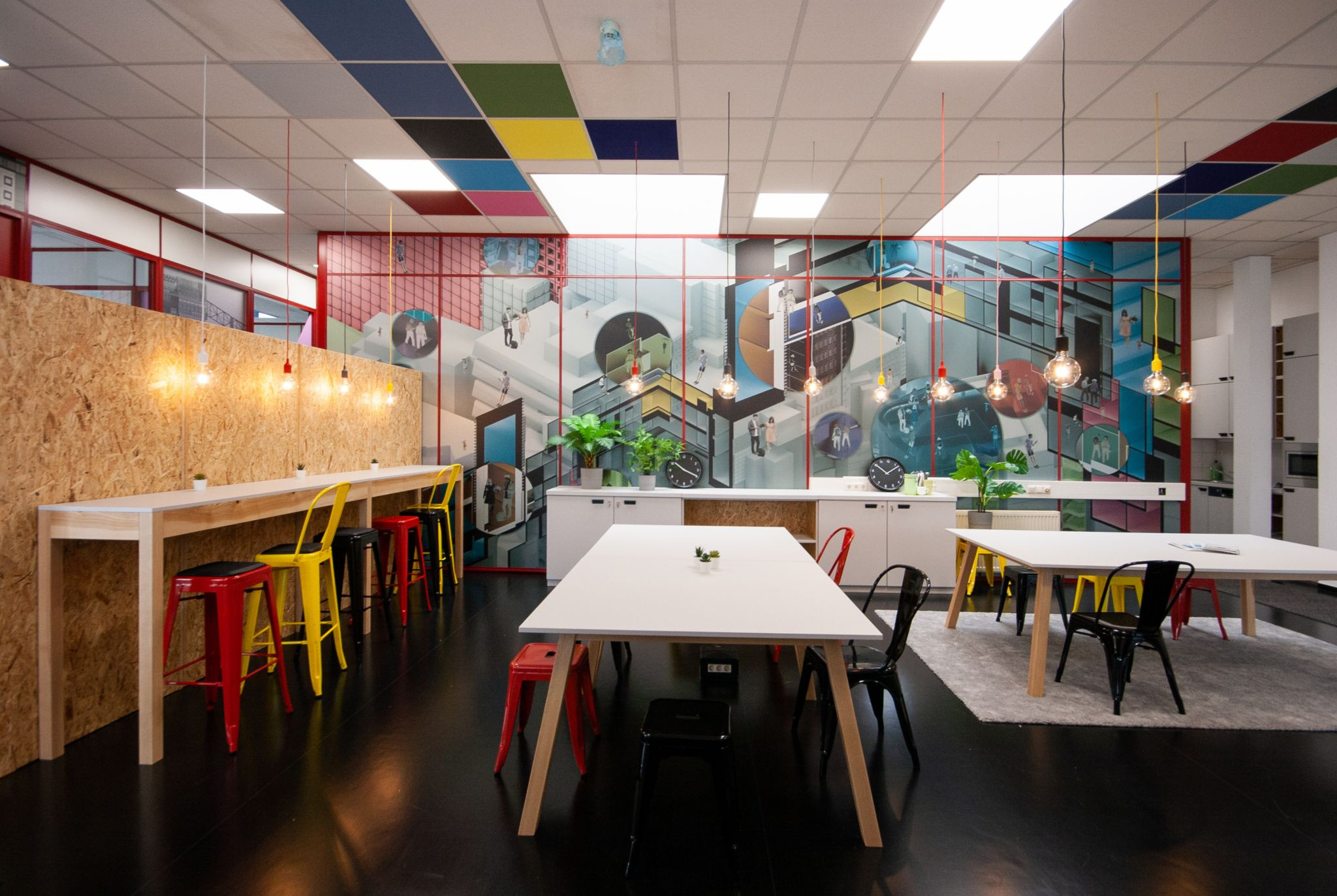 FRANKEN wurde für die Umgestaltung eines Büros in eine flexible Office Fläche (Hybrid Coworking und Private Offices) beauftragt. Die COWORKSTATT ist Teil des ITF Innovations- und Technologiezentrums Frankfurt-West, das verkehrlich perfekt angebunden zwischen Frankfurter Hauptbahnhof und Flughafen liegt. Im ITF-West sind innovative und traditionelle Unternehmen aus Handwerk, Handel, Produktion und Dienstleistung vertreten. Die Fläche besteht aus modular anmietbaren Private-, Fixed- und Mobile-Desk-Offices, Besprechungsräumen, offenen Arbeits- und Telefonnischen, sowie einer zentralen Community Fläche. Seitens der Eigentümerinnen wird seit vielen Jahren Wert auf Nachhaltigkeit im Sinne der Triple-Bottom-Line (Ökonomie, Ökologie und Soziologie/Funktionalität) gelegt. Entsprechend nachhaltig wurde auch die Fläche der COWORKSTATT geplant und errichtet: So wurden u.a. bestehende Strukturen intelligent revitalisiert, bisherige Rasterleuchten durch LED-Panels ersetzt und Ausstattung und Mobiliar mit hohem Anteil natürlicher Materialien ausgewählt. Neben identitätsstiftenden handgefertigten Schreinermöbeln aus unbehandelten Grobspanplatten wurden vorhandene Ausstattungen aufgearbeitet. Akustikelemente bestehen aus reiner Schafwolle und wirken damit nicht nur geräuschdämmend, sondern auch klimaregulierend. Optisches Highlight sind die exklusiv für die Fläche entworfenen Pop Architecture Graphiken, mit retro-futuristischen Motiven in leuchtenden Primärfarben, die perfekt auf die raumumspannenden roten Rasterelemente abgestimmt und durch ihre Transparenz wie Buntglasfenster wechselnde Lichtspiele produzieren. Internen und externen Nutzern stehen neben privaten und gemeinschaftlichen Nutzflächen zur Anmietung zusätzlich ein separierter, aufteilbarer Konferenzbereich mit Design-Thinking Möglichkeiten, Lounge und Cateringbereich zur Verfügung.