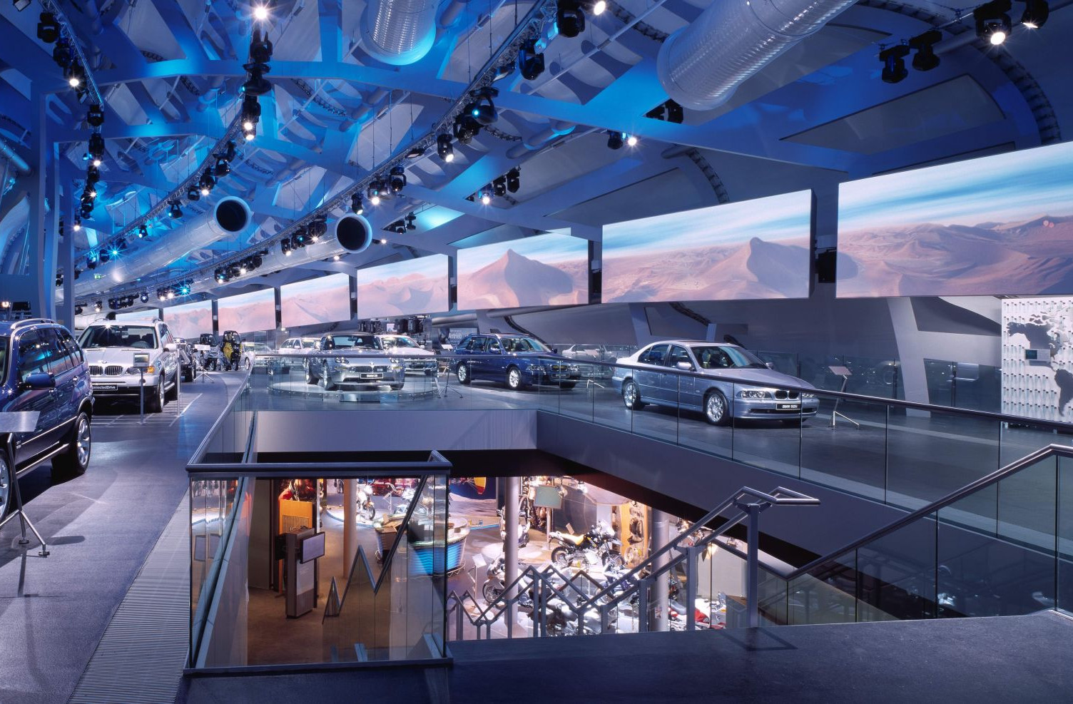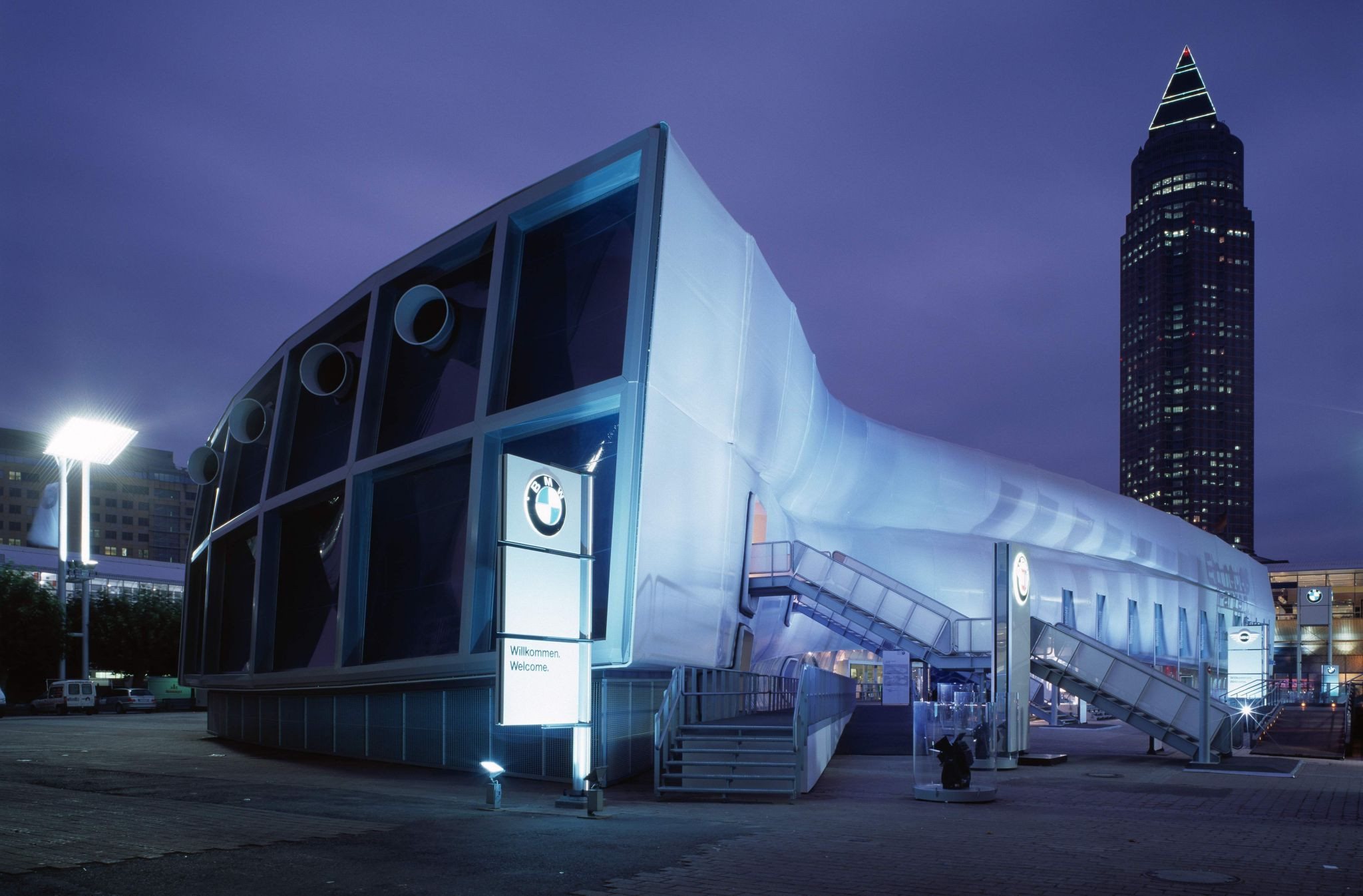 Das BMW Ausstellungsgebäude für die IAA 2001 fokussiert die Weltpremiere der neuen 7er Serie und drückt mit seiner dynamischen Form den BMW Markenkern aus: Freude am Fahren. Der Raum um die Fahrzeuge herum wird so beschleunigt, dass eine Empfindung des Fahrens suggeriert wird. In einer Computersimulation entsteht durch die Überlagerung von räumlich übersetztem Dopplereffekt und Umgebungskräften die Dynaform.