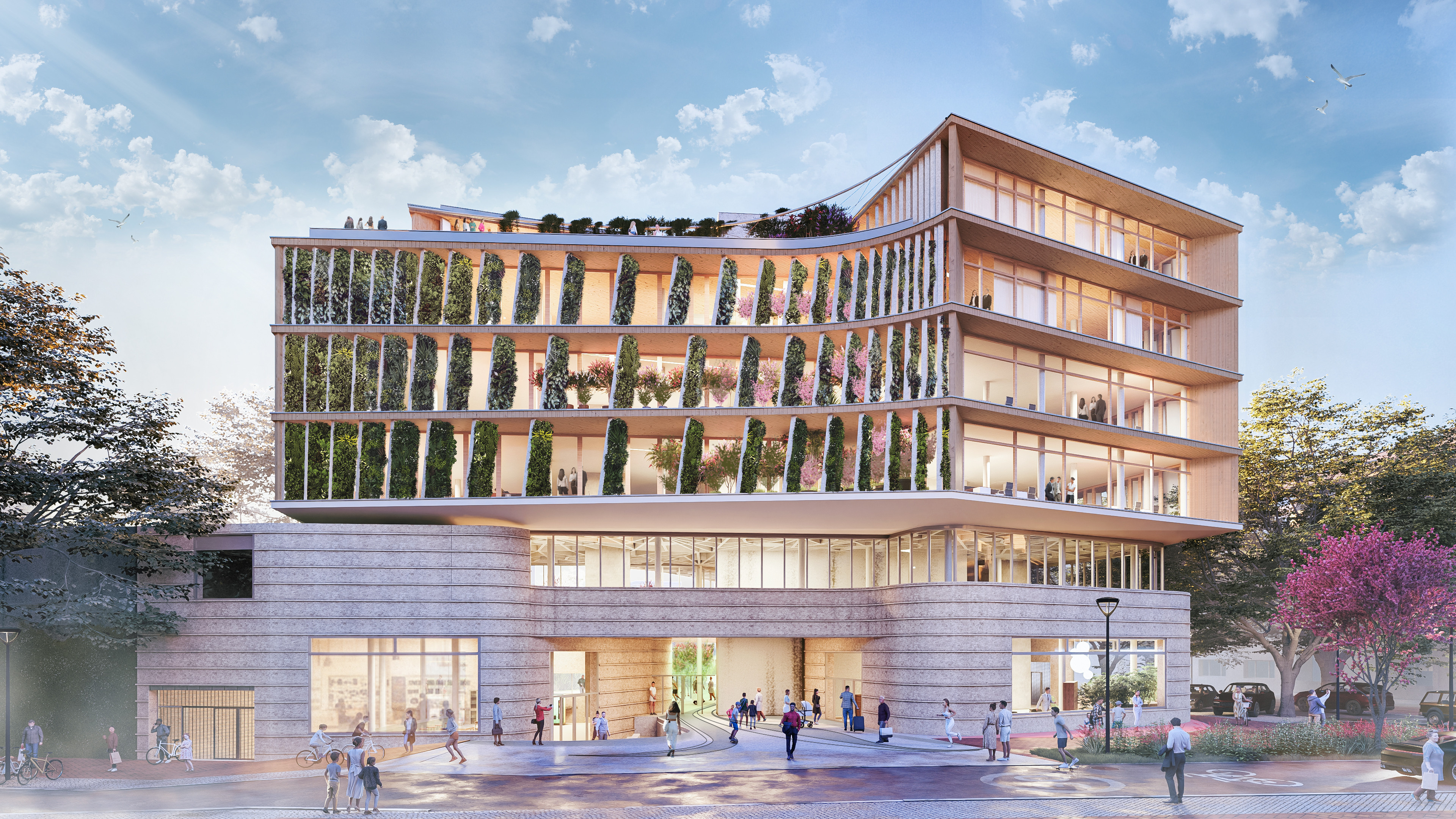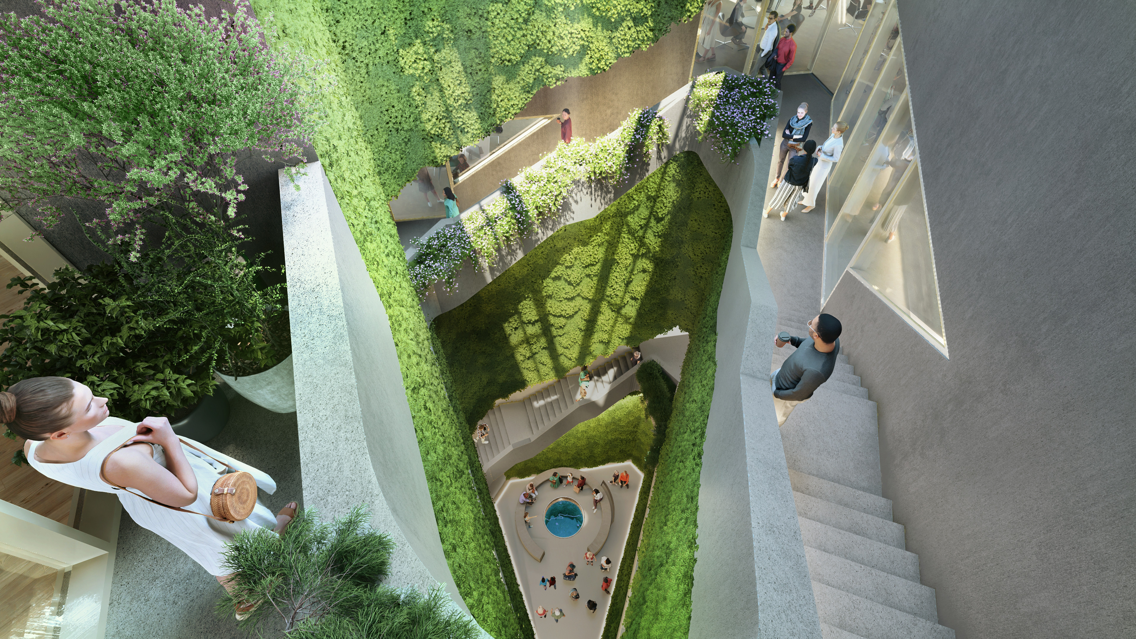 Im Inneren aktiviert ein zentraler Kern mit offener Dreifachhelix-Treppe die vertikale Abfolge der Nutzungen – von der unterirdischen Ausstellungsebene, über öffentlichem Foyer und Konferenzebene, Büro- und Wohnetagen bis zur begrünten Dachlandschaft. Fassaden, Terrassen und Dächer sind als vernetztes System aus Mikrohabitaten konzipiert. Das Gebäude selbst wird so zum lebendigen Ökosystem und Trittsteinbiotop.
