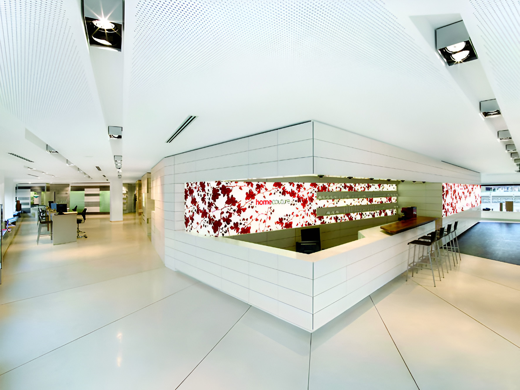 Für den Baustoffhändler Raab Karcher wird durch seinen ersten Flagshipstore für exklusive Fliesen, Armaturen und Badzubehör der neue Kundenkreis der Endverbraucher erschlossen. Im Mittelpunkt steht das sensorische Einkaufserlebnis in loungeartigem Ambiente. Als Highlight erhält die Fassade eine optisch-kinetische Installation, die einen Blick auf die Fliesen am Boden eines Swimmingpools assoziiert.