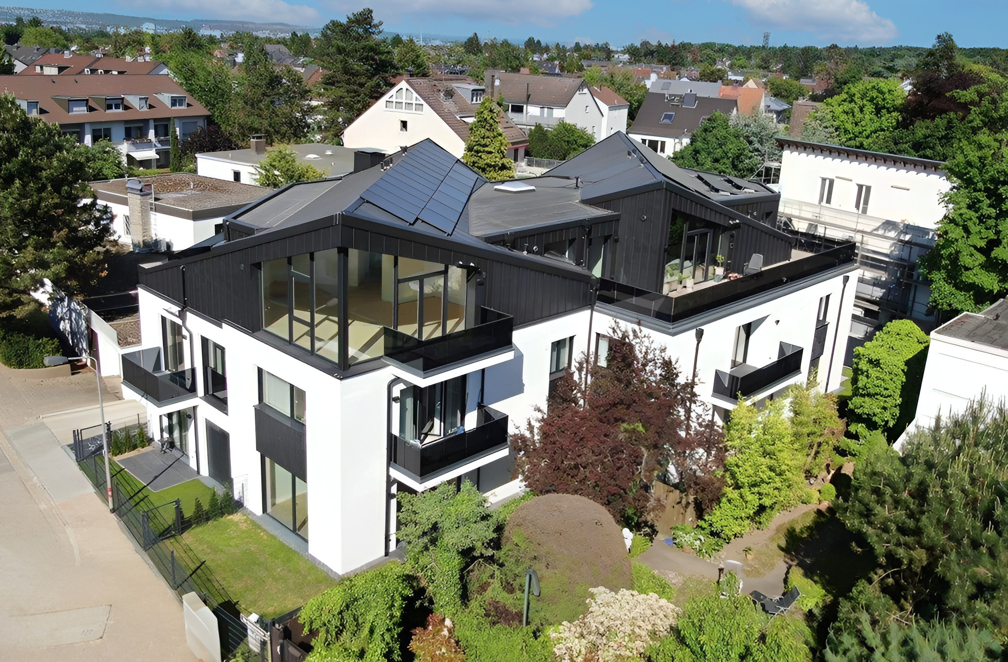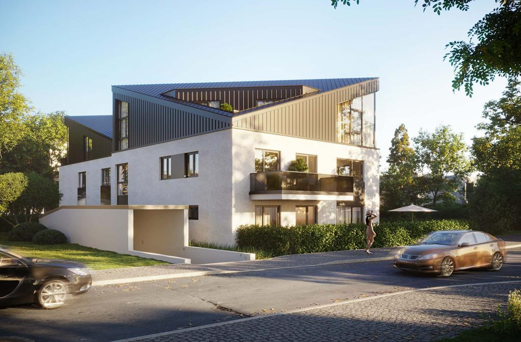 Das Grundstück liegt in einer Siedlung die durch ein- bis zweigeschossige Ein-, Doppel- und Mehrfamilienhäuser gekennzeichnet ist. Das geplante Mehrfamilienhaus mit Vollunterkellerung bzw. Tiefgarage und Dachgeschoss setzt sich aus zwei Baukörpern zusammen und fügt sich dadurch harmonisch in die Umgebungsbebauung.