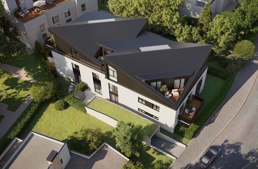 Das Gebäude besteht aus einem zweigeschossigen Baukörper mit einer geputzten Lochfassade mit bodentiefen Fenstern sowie einem Satteldach mit metallischer Deckung. Durch die verdrehte Firstrichtung werden die beiden Gebäudekörper noch besser ables- und belichtbar. Aus dem Dach sind Gauben zur Belichtung des Dachgeschosses ausgestellt. Im Erdgeschoss und im Obergeschoss liegen jeweils 4 Wohnungen. Im Dachgeschoss sind 3 Wohnungen vorgesehen. Die Erdgeschosswohnungen werden mit Terrassen- und Gartenflächen geplant. Die Wohnungen im Ober- und Dachgeschoss erhalten Balkone und Dachterrassen.