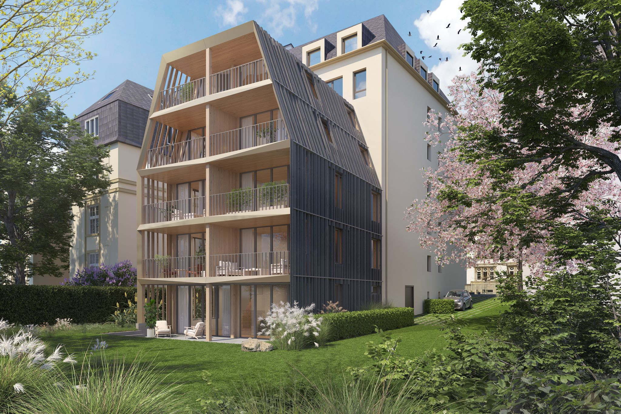 Hofseitig wird ein viergeschossiger, direkt an das Bestandsgebäude anschließender Holzbaukörper angebaut. Die Materialität im CO2 bindenden Holz und die Form des Anbaus als extrudiertes Profil verkörpern das zeitgenössische Bauen.
