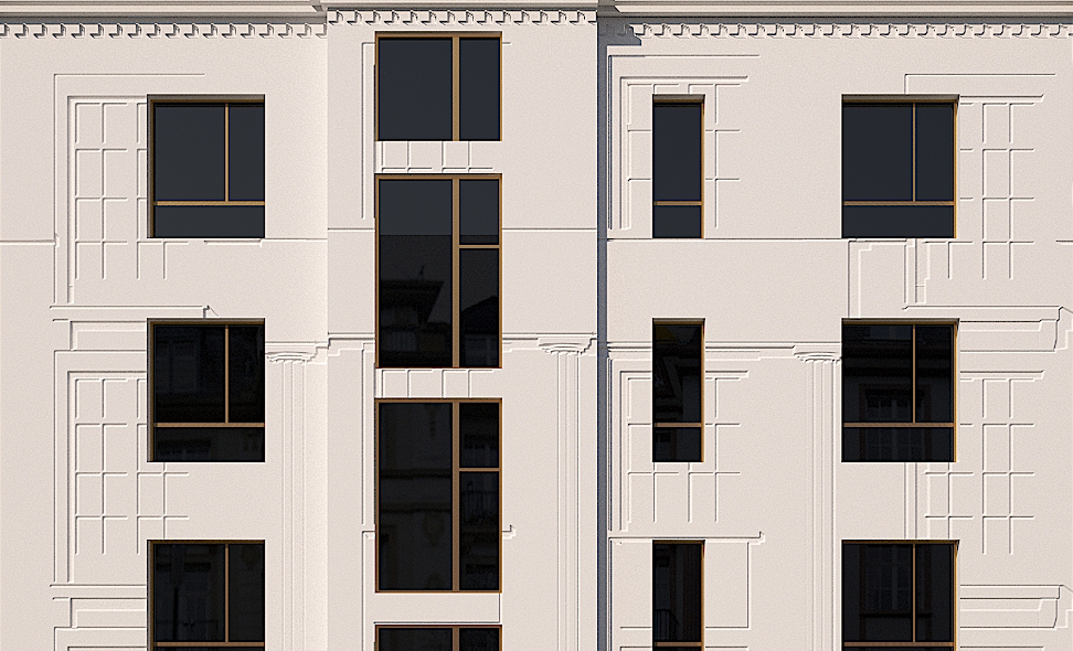 Der Entwurf von NESEN 3 orientiert sich an der gründerzeitlichen Blockrandbebauung des Viertels, bricht diese aber im Detail subtil auf. Es entsteht eine Assemblage aus drei Zeitschichten: Die Gründerzeit der Nachbargebäude, die 50er Jahre als Zeit des Bestandsgebäudes und die Jetztzeit (2023). Die im Krieg zerstörte Gründerzeitfassade überschreibt als Schattenriss gemäß der alten Planunterlagen die reduzierte Lochfassade der 50er Jahre. Eine dreidimensionale Fräsung in der Fassade erzeugt ein Nachbild der historischen Fassade.