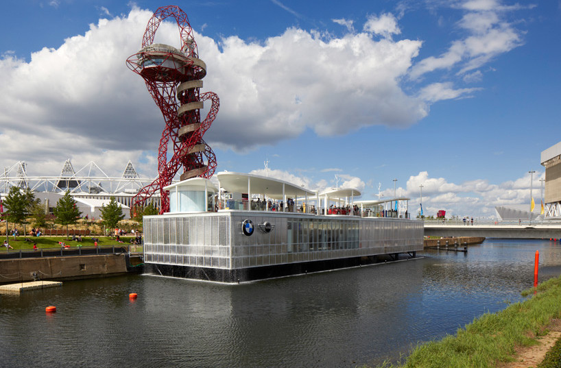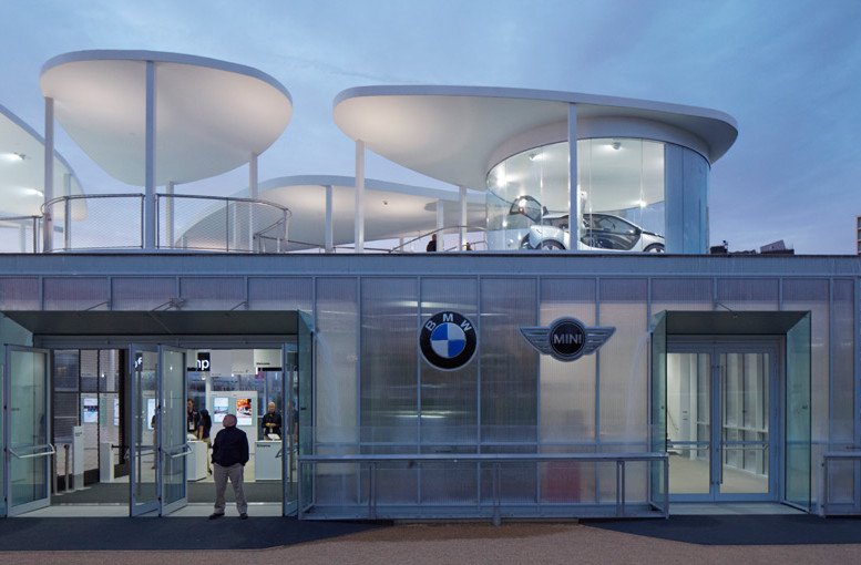 FRANKEN wurde als Generalplaner, gemeinsam mit Serie Architects als Entwurfsarchitekten, für den Bau des Showcase Pavillon der BMW Group im Olympiapark in London beauftragt. Die BMW Group als offizieller Automobil Partner der olympischen und paralympischen Spiele in London 2012 errichtete den temporären Showroom für die Dauer der Spiele. Der BMW Group Pavillon wurde auf einer Anhöhe über dem Waterworks River aus einer Stahlkonstruktion errichtet. Das innovative Design verwendete Flusswasser als nachhaltige Quelle für die Kühlung des Gebäudes, das gefilterte Wasser wurde als Blickfang in Form eines Wasservorhangs in den Fluss zurückgeführt. Das obere Geschoss besteht aus sieben leichten Pavillonstrukturen, die wie Blätter auf der Wasserfläche des Daches zu schwimmen scheinen. Hier wurden die neusten Innovationen im Fahrzeugbereich, sowie die neuen BMW I-Cars präsentiert. Der Besucherstrom wurde über eine Abfolge von Brücken durch die Pavillon-Landschaft geführt. Im Erdgeschoss gab es den Ausstellungsbereich mit interaktiven Exponaten für die Besucher, die BMW´s Vision von nachhaltigen Innovationen und die Unterstützung des GB-Olympiateams vermittelte.