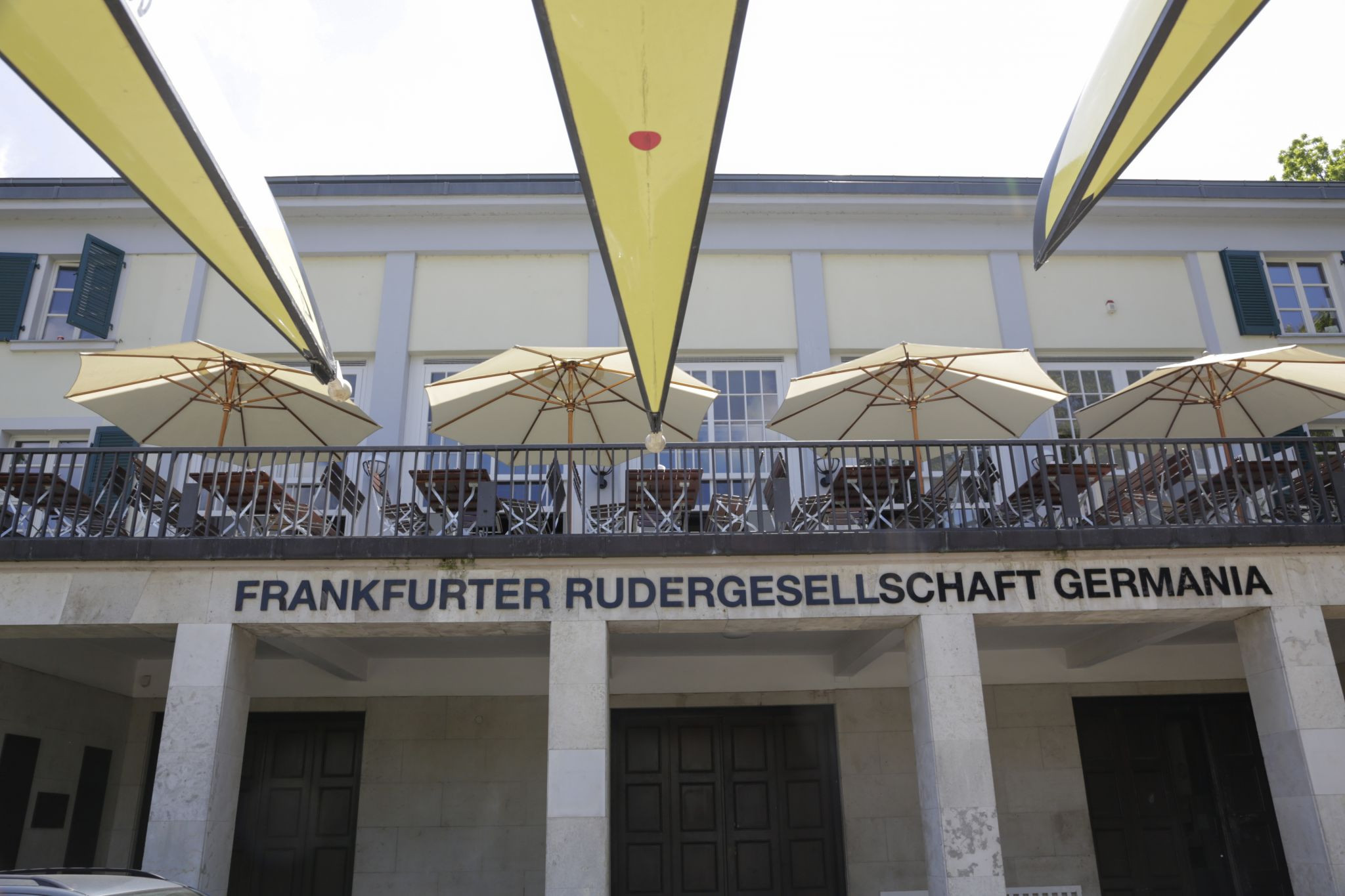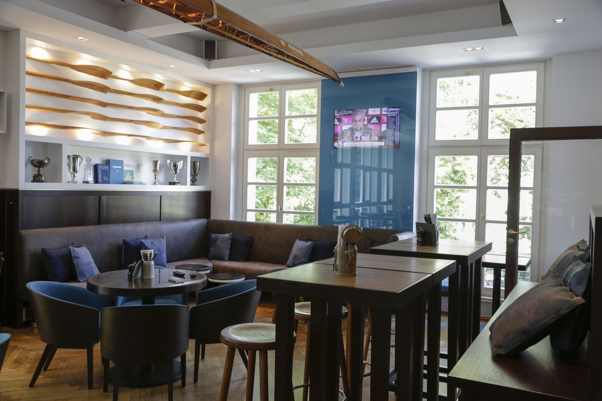 FRANKEN gestaltete den Umbau des vom Familienunternehmen Meyer betriebenen Vereinslokal im Clubhaus der Frankfurter Rudergesellschaft “Germania“ 1869 e.V. Das gestalterische Leitthema ist inspiriert von der ungezwungenen Lässigkeit der Italienischen 60er Jahre gemischt mit maritimen Elementen und Gründerzeitbestand. Dies wird durch dunkle Holzwandverkleidungen, braune Marmortischplatten, hellblaue Samtbezüge der Sessel und Messing als Regalbordkanten sowie Füße der Tische und Sofas assoziiert. Unter der Decke hängt der namensstiftende umgedrehte Renn-Einer, dessen offene Luftkästen als Leuchtkörper funktionieren. Der monolithische Block der Bar aus braunem Kunststein auf gelben Epoxitharz steht dazu im Kontrast und verweist auf die Hightech Materialien des modernen Rudersports. Ein weiteres Element ist eine Installation aus zwölf Ruderblättern, deren Neigungswinkel die Phasen eines Ruderzuges nachbilden. Das Gesamtergebnis ist eine stimmige Mischung aus Tradition und Moderne, die gewachsen und nicht geplant wirkt.