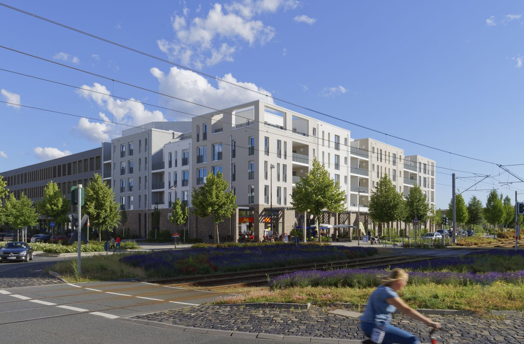 Das Projekt teilt sich in sieben dezent farbig abgesetzte Häuser, dem Erscheinungsbild einer klassischen Lochfassade mit auf ein Raster abgestimmten, wechselnden Fenstergrößen, welche durch filigraner wirkende Zwischenbauten der Loggien verbunden sind. Dadurch ist die Blockrandbebauung aufgebrochen und das Wohn- und Geschäftshaus mit vier Vollgeschossen und einem Staffelgeschoss wirkt elegant, in sich gehalten, ruhig und ordnend. Klinkerriemchen im Sockelbereich der Fassade betonen die Flächen zwischen den Schaufenstern der Ladenebene und vermitteln Hochwertigkeit und Anspruch.