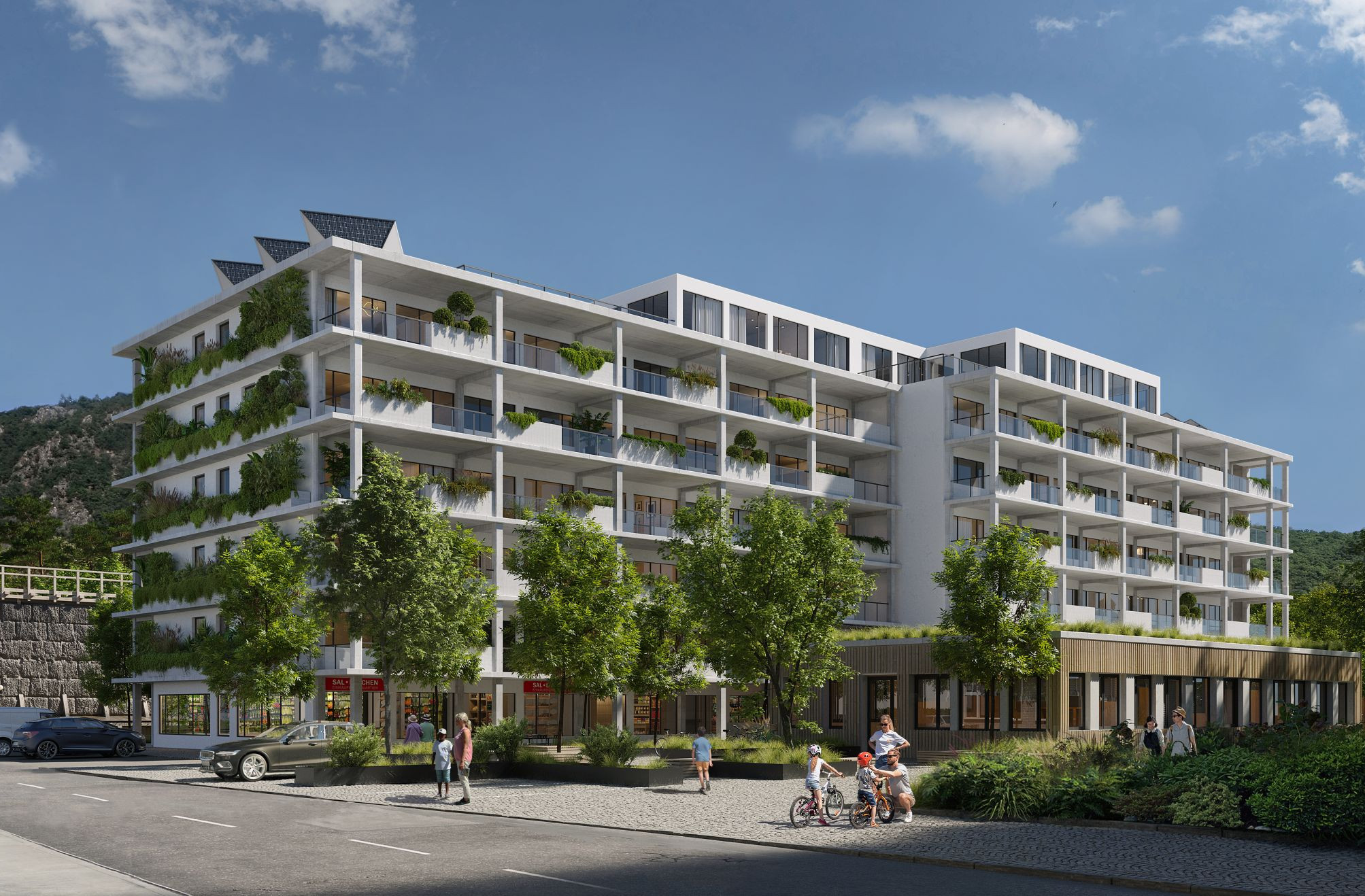 Das Sal-Quartier ist ein grünes und nachhaltiges Quartier mit einer sehr hohen Luft- und Wohnqualität. Der Park und das gesamte Umgebungsgrün wird entlang des Wohngebäudes als eine Verlängerung des Parks in die Vertikale gezogen. Die außenliegende Erschließung durch Laubengänge sowie die wohnraumerweiternden Wintergärten bilden einen weiteren transitorischen Raum zum Park.