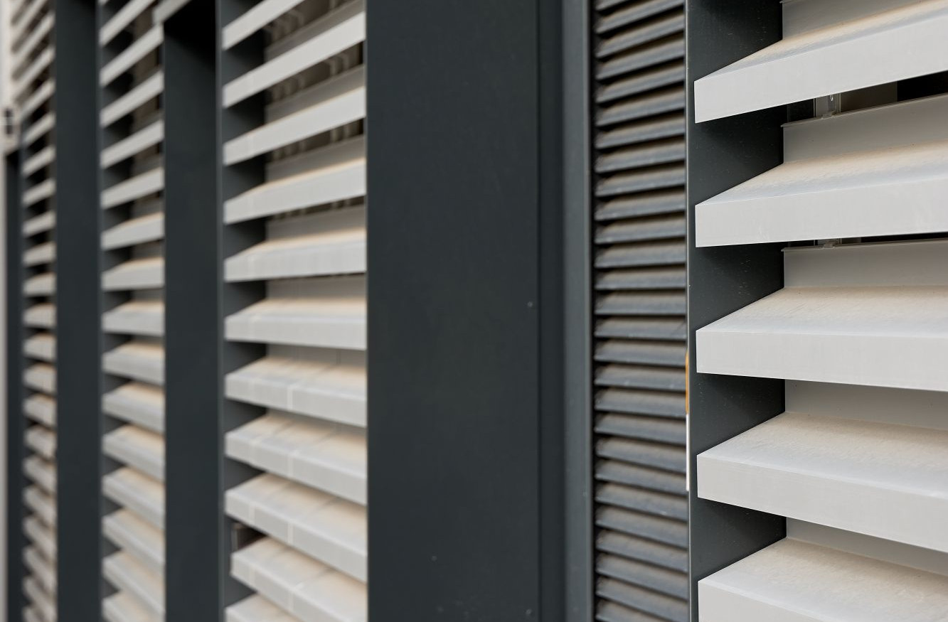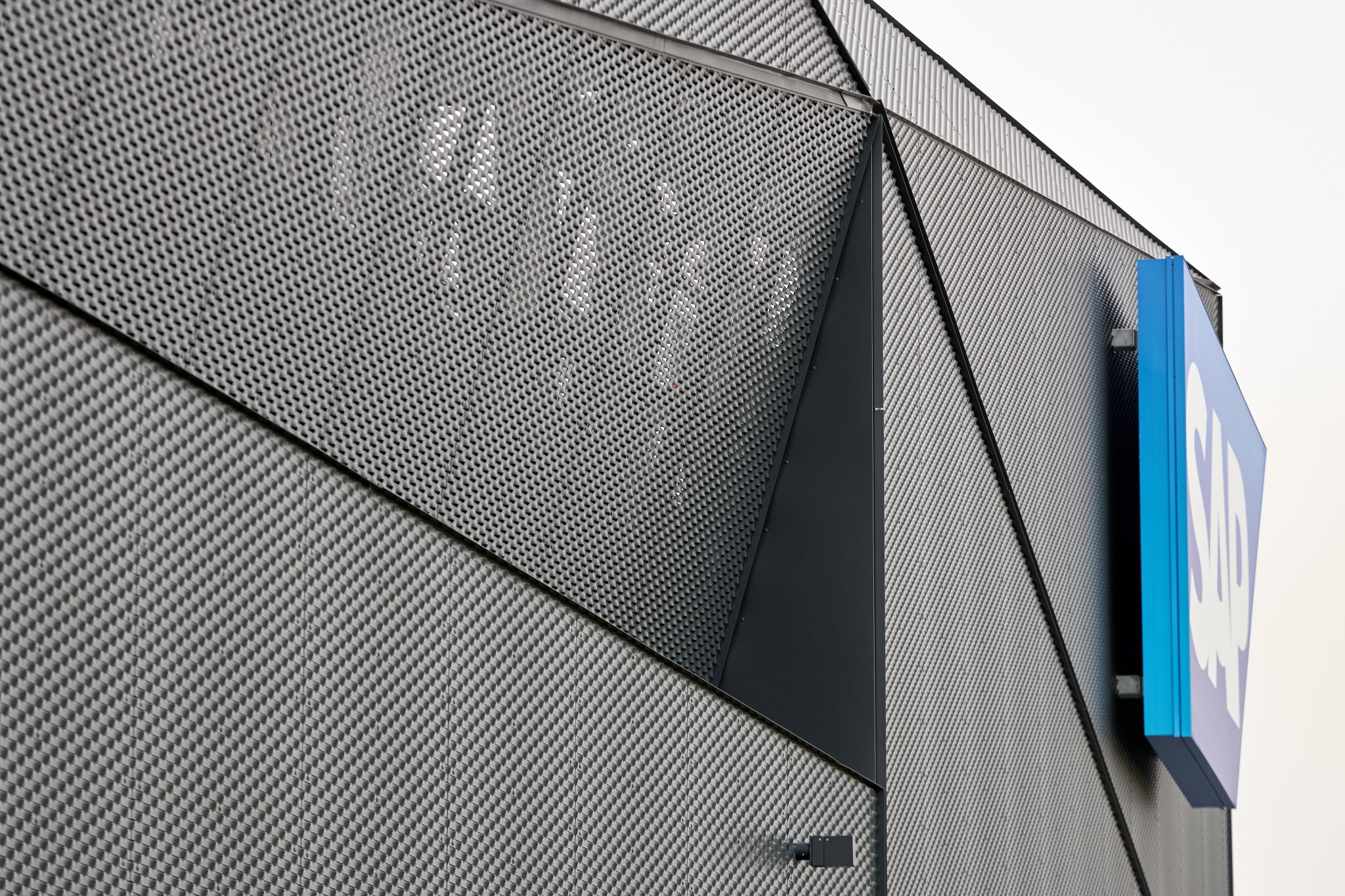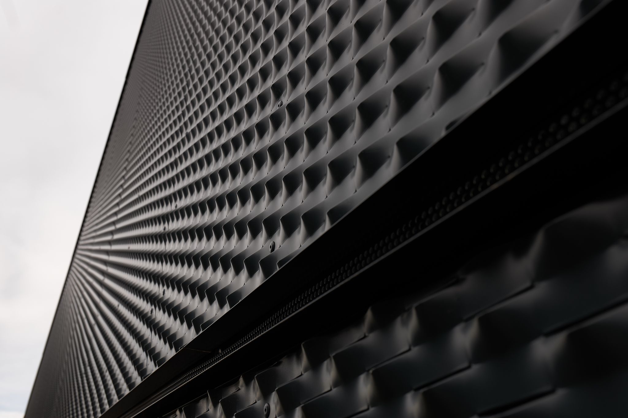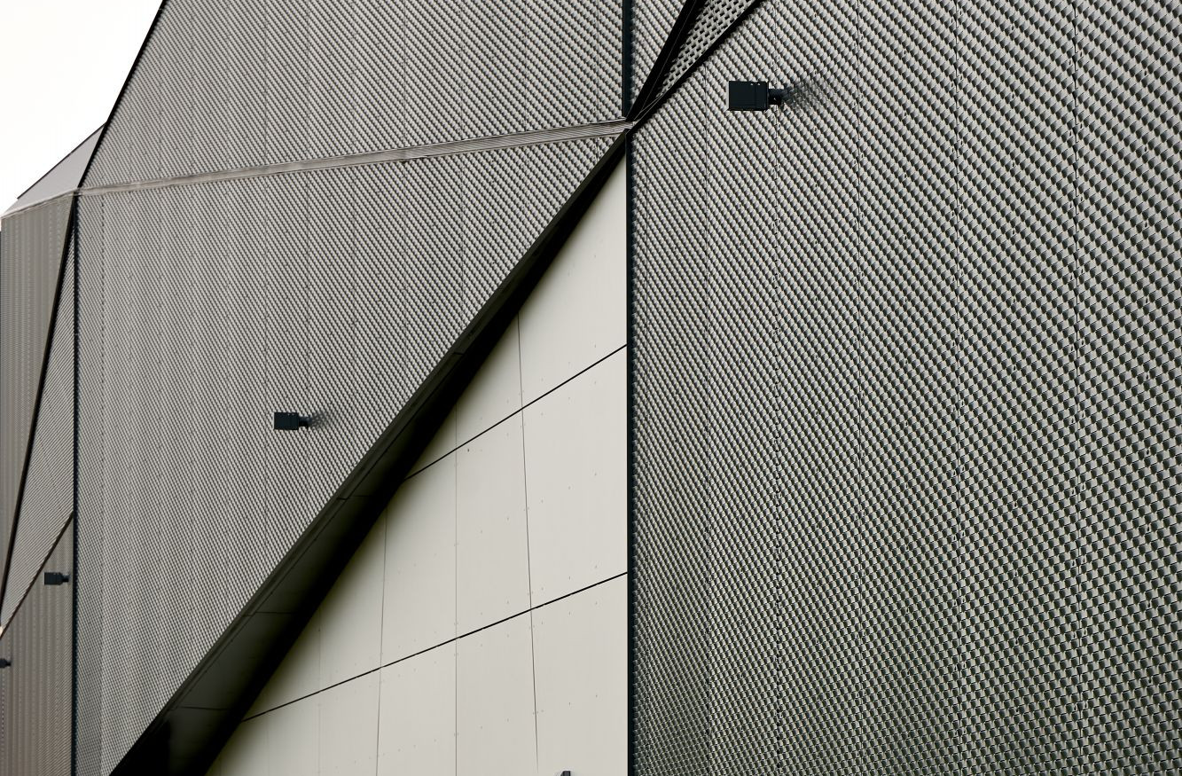 Als weiteres originäres Gestaltungsmerkmal ist die semitransparente Hülle in triangulierte Facetten aufgebrochen, die die orthogonalen Grundkörper dreidimensional gefaltet umspielen. Die im Gebäudevolumen nicht differenzierte Modularität der Datenhallen wird durch eine Rhythmisierung der Hülle mit Facetten, die über den Sockel bis auf den Boden gehen, ablesbar.