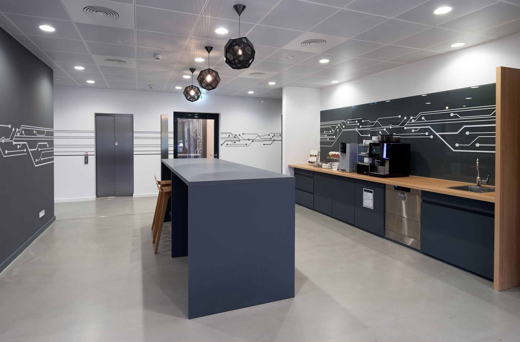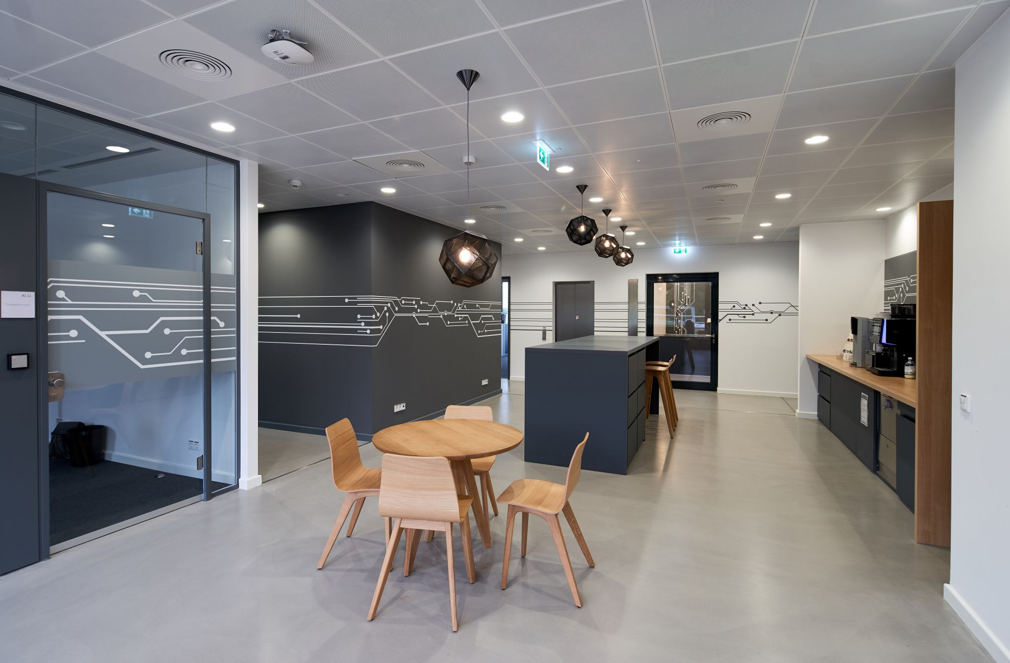 Das Interior des Verwaltungsgebäudes ist in Zusammenarbeit mit "Der Büroeinrichter" entstanden. FRANKEN hat mit diesem Projekt die Bauaufgabe Rechenzentrum als Back-End des Digitalen Zeitalters formgestalterisch neu definiert.