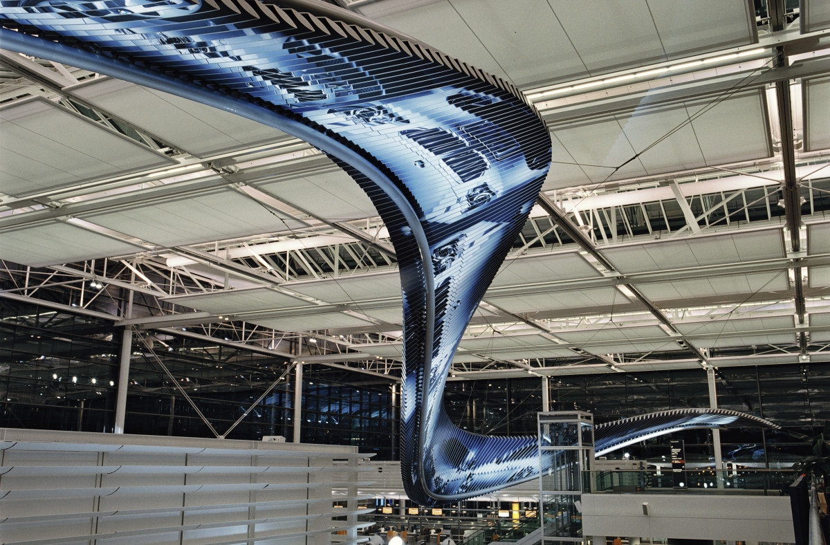 Als Werbeträger für das neue Terminal II am Münchner Flughafen wird eine Kombination von Markenkommunikation und Kunstobjekt mit optisch kinetischer Interaktivität geschaffen. Die Leichtigkeit und Eleganz der Konstruktion und die Faszination der technischen Details verweist auf BMW als Ingenieursmarke.