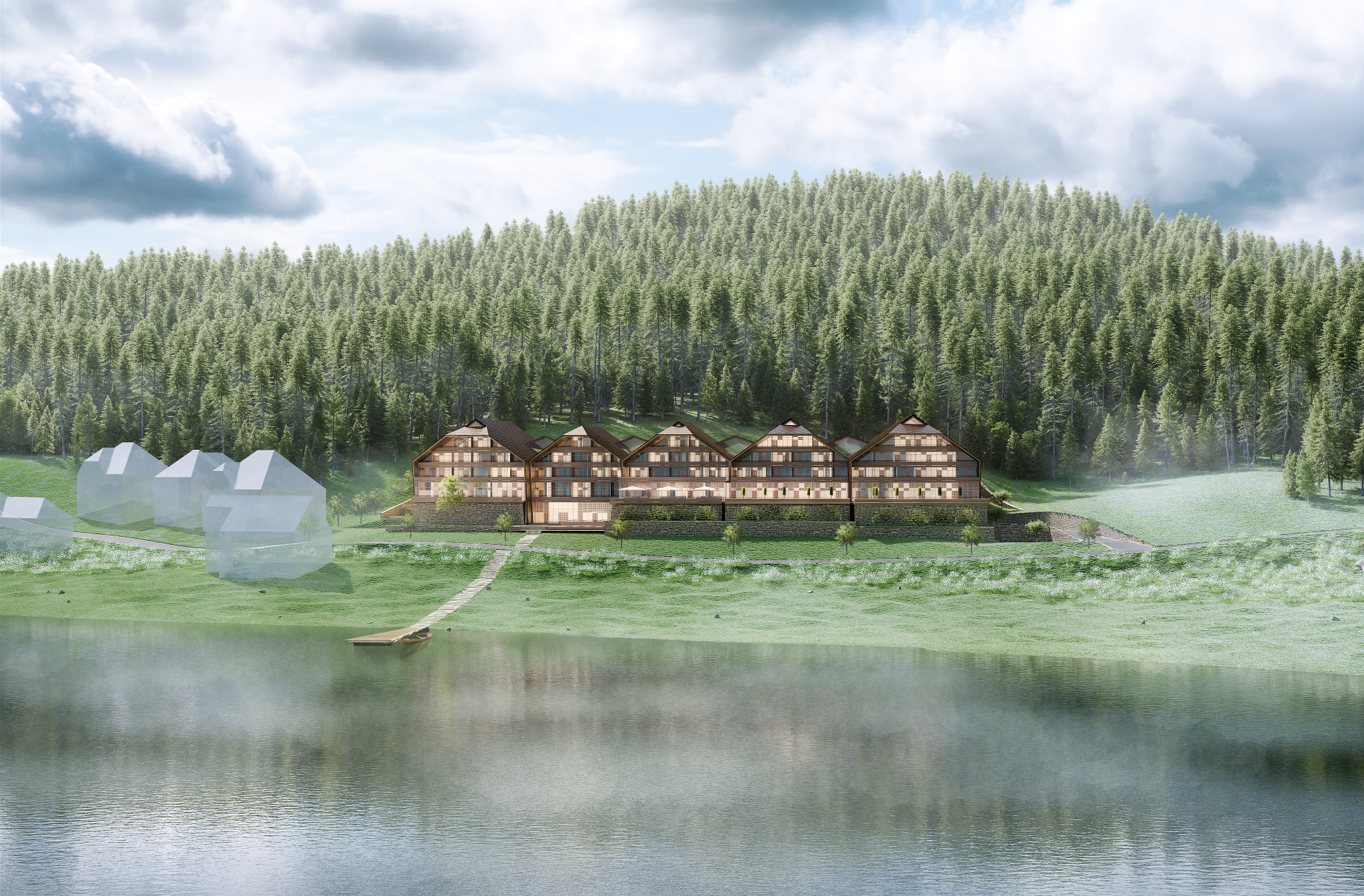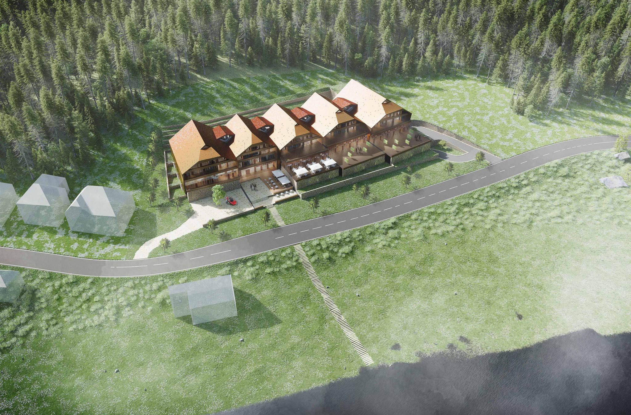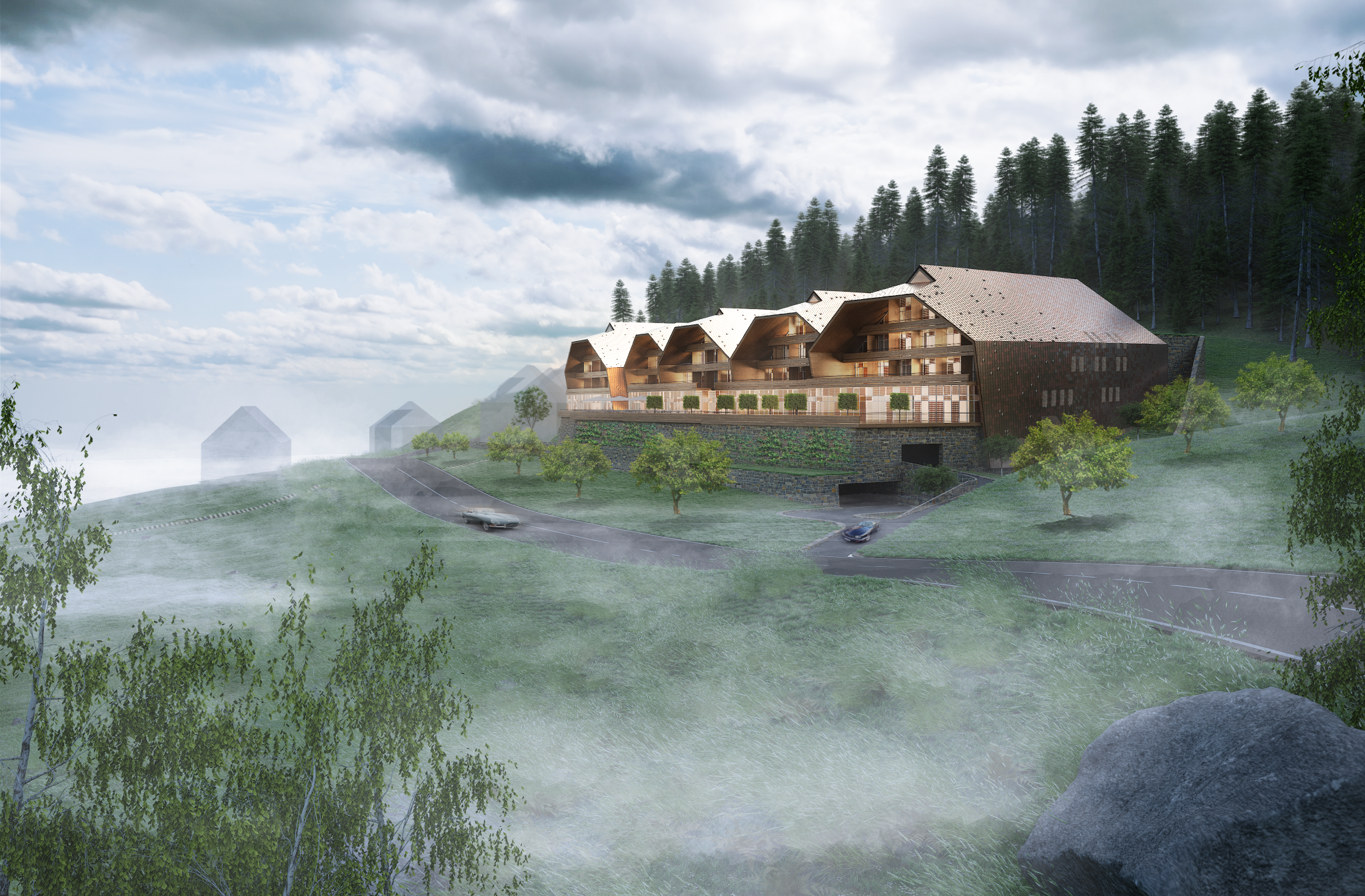 Das plastisch ausgeformte Dach überzieht die 120 Zimmer des Hotels mit einem Gewand, welches über den landschaftlich ausgeformten Konferenz- und Restaurantterrassen schwebt. Die Oberfläche wird aus Schindeln mit einer Kupfer-Aluminium-Legierung gebildet, die an patinierte lokale Holzschindeln erinnern und je nach Licht, Wetter und Verwitterung individuelle Erscheinungsbilder erzeugen. Die Oberflächen werden in unterschiedlich vorbewitterten Farbtönen in einem Verlauf von hell zum See zu dunkel am Wald eingebaut. Alle sichtbar innenliegenden Bauteile unter dem Dachgewand sind aus tragenden Brettschichtholzplatten ausgebildet. Das Holz referenziert an die lokale Bautradition, wird aber zeitgenössisch als High-Tech-Material eingesetzt. Die vertikale Innenseite der Häuser ist eine verglaste Pfostenriegelfassade mit unregelmäßig verteilten Öffnungsflügel aus Holz. Vertikale Lamellen aus Kupfer-Aluminium vor der Fassade wirken wie halb aufgeschobene Vorhänge. In der Summe entsteht ein belebtes Spiel aus offenen zu geschlossenen Fassadenelementen.