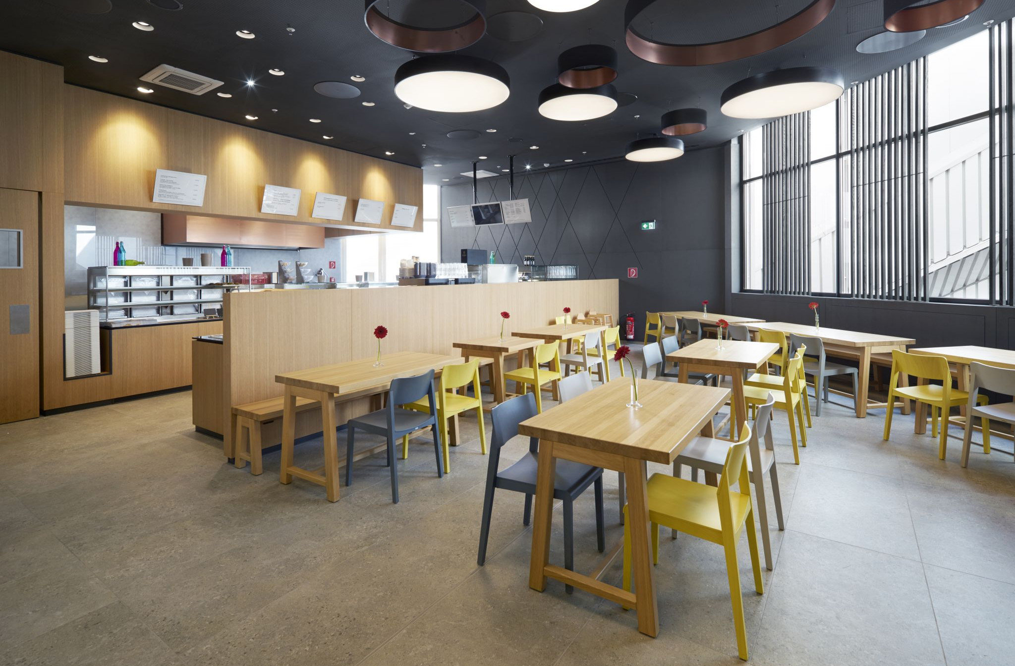 FRANKEN wurde von der Messe Frankfurt für die Neugestaltung einer dreigeschossigen Gastronomieflächen in Halle 6 beauftragt. Das gastronomische und gestalterische Leitmotiv des Restaurant Westend auf Ebene 1 ist ein regionales Konzept. Im Zwischengeschoss befindet sich die Küche, in Ebene 2 das asiatische Konzept New Site. Das Leitmotiv im Westend ist ein zeitgenössisch interpretiertes rustikales Interior, dieses inszeniert sich in Details wie dem in Holzoberflächen eingefrästen „Gerippte“ Rautenmuster von Apfelweingläsern oder den Massivholzmöbeln aus Eiche mit kontrastierenden Designerstühlen und kommunikationsfördernden Community-Tischen in der Mitte. Die Materialität und Farbe von Einbauten, rauer Bodenoberflächen sowie der U-förmigen Ausgabeinsel mit warmgewalzter Stahlverkleidung strahlt Wärme und Gemütlichkeit in den ganzen Raum aus.